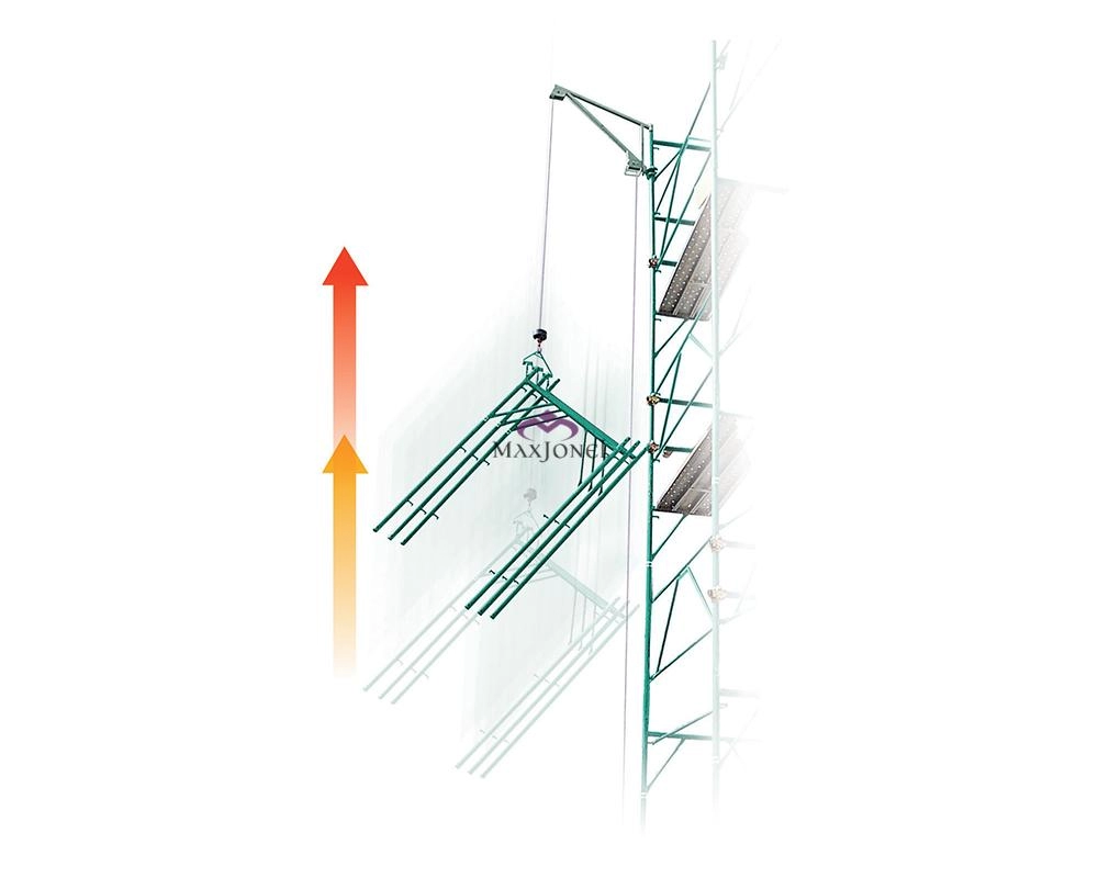 Dupa ce ai montat electropalanul la baza schelei, montezi bratul superior pe ultimul etaj montat de schela, iar acesta, fiind foarte usor, se ridica cu fiecare etaj pana se monteaza toata schela.